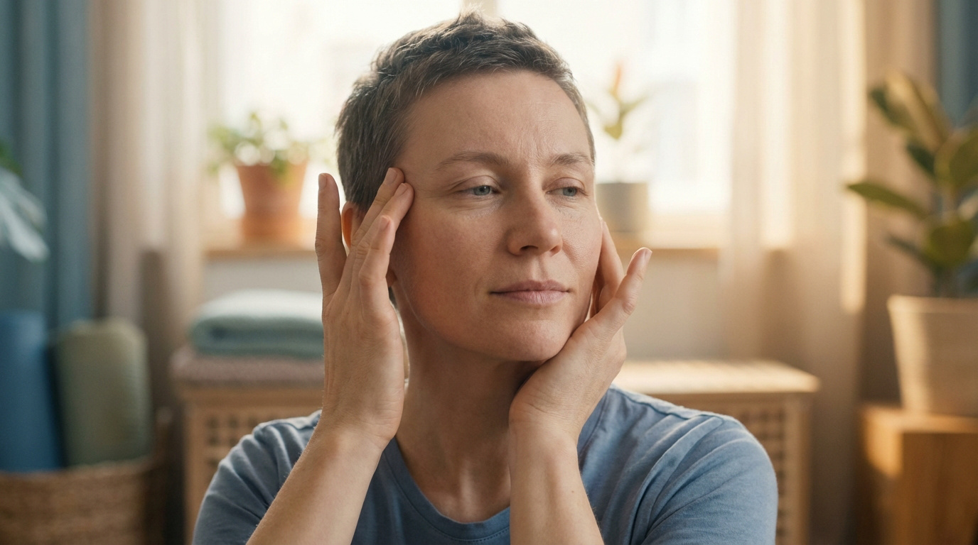 Glissez ensuite vers les tempes avec légèreté. Relâchez immédiatement la pression si vous percevez une pulsation sanguine. Respirez calmement pendant cet exercice précis pour maximiser l’effet de détente.